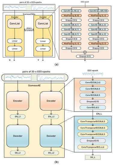 For Siamese CNNs, we employed two-branched CNNs to encode the input pair of EEG epochs, as shown in Figure 2a. According to previous studies [,], convolution with small filter sizes is better for extracting temporal information. Convolution with a larger filter size is better for extracting frequency information from EEG. Moreover, different filter sizes can also capture features from various frequency bands []. Therefore, the filter (kernel) sizes of the two CNN branches were different.