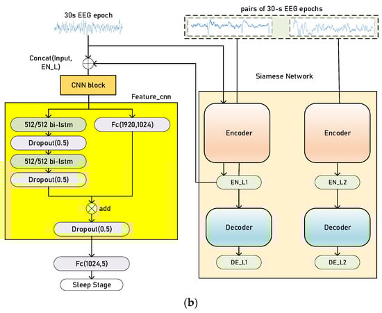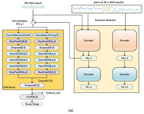 During pretraining, as shown in Figure 3, a pair of EEG epochs is firstly fed into the Siamese AEs. The encoder of our Siamese AEs maps the inputs into latent features EN_L. Then, every 30 s, the EEG epoch is encoded by one branch of Siamese AEs, producing the latent representation to be concatenated with the original EEG epoch. The concatenated data is then fed into the sleep staging model. The basic model in the pretraining stage is the CNN block, and the output of decoder DE_L is used for the calculation of the loss function. Similarly, for Siamese CNNs, the latent feature vector to be concatenated is the output of the encoder. Since the loss function of Siamese CNNs does not need to reconstruct the original input, there are not any decoders in Siamese CNNs.