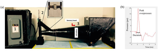A custom advanced blast simulator (ABS) (200 cm × 30.48 cm × 30.48 cm) (Figure 2a) located at the Center for Injury Biomechanics (Virginia Tech University, Blacksburg, VA, USA) was used to generate a single blast wave. To produce, develop, and dissipate the blast wave, the ABS is divided into three parts. First, helium is compressed in the driver chamber using calibrated acetate membranes. Once passively ruptured, the blast wave is generated as it propagates through the transition chamber and reaches the animal in the “testing section” area. The blast wave continues to flow and will dissipate once reaching the end-wave eliminator located downstream of the testing chamber. As a final result, the animal was exposed to a single peak blast wave, recreating a free-field blast exposure. Pressure measurements were collected at 250 kHz using a Dash 8HF data acquisition system (Astro-Med, Inc, West Warwick, RI, USA). A customized Matlab (MathWorks, Inc, Natick, MA, USA) script was used to analyze pressure profiles and determine the impulse, duration, and rising time of the positive and negative phases. Rankine—Hugoniot relations and observed wave speed at the sensors within the ABS’s animal testing section were used to calculate the peak overpressure.
