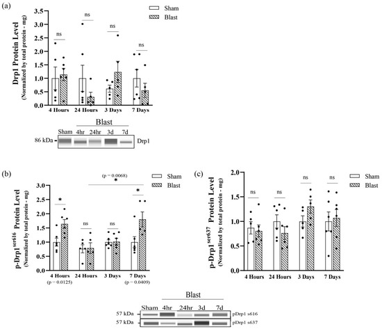 Analysis of total GTP-DRP1 protein levels and total DRP1 post-translational modification protein levels at serine 616 and serine 637 post single mechanical exposure—in vivo model of bTBI. Western blotting was conducted using an automatic capillary-based system (Wes, Protein Simple) to look at relative protein quantification to identify possible fission post-overpressure exposure. Only for qualitative visual comparison, digitized bands illustrate how proteins moved through the capillary system on the Wes. (a) There were no significant changes in DRP1 protein levels at 4 h, 24 h, 3 d, and 7 d following blast wave exposure. (b) The total levels of p-DRP1s616 protein were acutely increased by 4 h, returned to physiological levels at 24 h and 3 d and shifted back to an increase at 7 d post blast wave exposure. (c) The total levels of p-DRP1s637 protein were maintained at physiological levels at all-time points. (n = 6/group; data are mean ± SEM; *p-value represents ≤ 0.05; ns-value represents not significant).