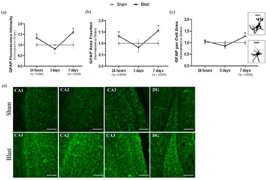 Next, we focused on characterizing the time course of hippocampal astrocyte reactivity from adult male rats’ exposure to a blast wave. To assess the reactive phenotype, protein and fluorescence levels of GFAP were analyzed by Western blotting and microscopy at 4 h, 24 h, 3 days, and 7 days. Results indicated a significant increase in total GFAP protein levels starting at 24 h (p = 0.0469) (Figure 7a), which also corresponded with an increase in GFAP fluorescence intensity (p = 0.0082) (Figure 8a), as well as an increase in GFAP area fraction (p = 0.0064) post-single blast exposure (Figure 8a). Increased area fraction may indicate the increased number of astrocytes in the injured hippocampus. The response was shifted back to physiological (sham) levels at three days post-blast wave (Figure 7a and Figure 8a). At 7 days post blast wave, hippocampal astrocytes presented a significant increase in total GFAP protein (p = 0.0311), GFAP fluorescence intensity (p = 0.0078), GFAP area fraction (p = 0.0072) (Figure 8a), and a further increase in GFAP per cell area (p = 0.0059) (Figure 8a), and presumably, this could signify changes in the cytoskeleton and main processes. Furthermore, each hippocampal sub-region was analyzed separately with the same data parameters. The results indicated that the total hippocampus data correctly represented a diffuse injury across the hippocampus since a significant difference was observed in each sub-region at 24 h and seven days, and no changes were observed at 3 days post blast wave exposure (Figure S6). Together, those data indicate the astrocyte reactivity phenotype following mild bTBI upregulates GFAP and is a well-represented marker for reactivity in TBI.