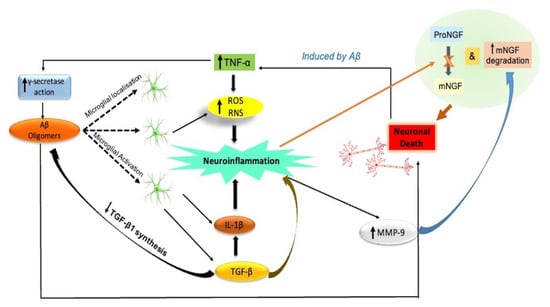 Neuroinflammation: A key initiating component in the development of AD. Signaling of neurotrophins is impaired. By inducing microglia to release proinflammatory cytokines (IL-1β and TNF-α) and blocking the production of anti-inflammatory cytokines such as TGF-β1, Aβ oligomers cause neuroinflammation and neuronal death in the AD brain. TNF-α promotes g-secretase activity and prevents microglia from phagocytizing Aβ, which promotes Aβ build up and microglia-mediated neuroinflammation. Through the production of ROS and RNS, proinflammatory microglial activities also accelerate the death of neurons. Eventually, neuroinflammatory phenomena may play a role in the pathogenesis of AD by impairing neurotrophin signaling. This includes decreasing the synthesis of TGF-β1 and impairing the NGF metabolic pathway, which is characterized by a decreased conversion of proNGF to biologically active mNGF and a higher rate of mNGF degradation aided by MMP-9. Aβ, amyloid beta; IL-1b, interleukin-1 beta; MMP-9, metalloprotease-9; NGF, nerve growth factor; mNGF, mature nerve growth factor; proNGF, precursor of the nerve growth factor; RNS, reactive nitrogen species; ROS, reactive oxygen species; TGF-β, transforming growth factor-beta; TNF-α, tumor necrosis factor-alpha.