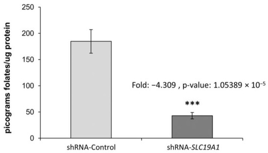 Cellular folate content in SLC19A1-KD cells and in their unaffected controls. Fold-change: −4.309, p-value: 1.05389 × 10−5. ***: Difference between shRNA-Control and shRNA-SLC19A1 is statistically significant, p-value ≤ 0.001.