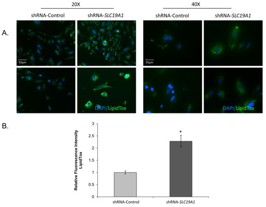 Lipid droplet accumulation in SLC19A1-knockdown THLE2-cells. SLC19A1-KD THLE2-cells develop steatosis spontaneously and show impaired lipid metabolism. DAPI (blue staining) for nucleic acids and LipoTox (green staining) for lipids. Scale bar added to 20× and 400× images. *: Difference between shRNA-Control and shRNA-SLC19A1 is statistically significant, p value<0.05.