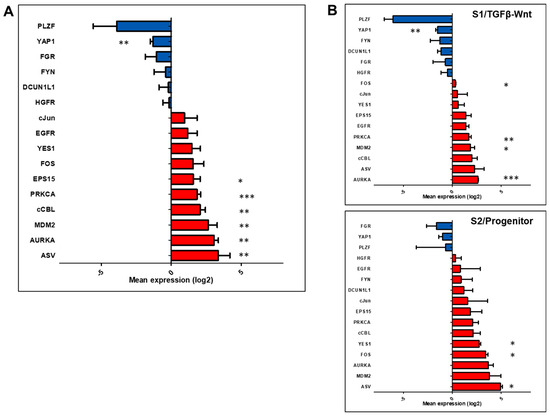 Baseline mRNA expression of targets in the various HCC cell populations. (A) Distribution of targets showing the upregulated and the down-regulated proto-oncogenes. (B) Distribution of relative expression of candidate targets between the S1 and S2 cell populations. Data are presented as the mean expression values (log2) from three independent samples of each cell lines. Statistical analysis: * p < 0.05, ** p < 0.01, *** p < 0.001 using the one-sample t-test vs. mean expression of immortalized hepatocytes IHH as 0.00. Red—up-regulated, Blue—down-regulated.