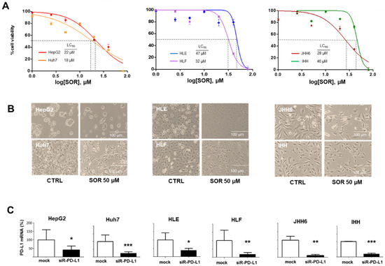 The Sorafenib and PD-L1 mRNA silencing treatments in in vitro models. (A) Cell viability upon 24 h treatment with 1 µM to 80 µM of SOR. Dashed lines show the value of LC50. (B) Cell morphology after 24 h treatment of 50 µM of SOR. (C) Down-regulation of PD-L1 mRNA expression after 48 h of 20 nM PD-L1 silencing. Graphs presented as mean ± SD calculated from at least three independent experiments. Statistical analysis: * p < 0.05, ** p < 0.01, *** p < 0.001 using Student’s t-test (vs. mock) in each cell line. SOR: Sorafenib, siR-PD-L1: PD-L1 silencing.