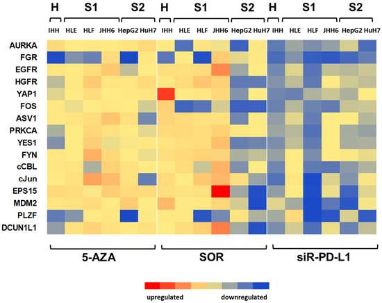 Immunotherapy is another targeted therapy that we evaluated in this study. In clinical practice, combination between Atezolizumab, an anti-PD-L1, and Cabonzantinib (anti-VEGFR) had shown potential as first-line treatment [12]. PD-L1, expressed primarily in cancer cells, was related to HCC prognosis [47,48]. In this study, we directly targeted the PD-L1 gene in cancer cells by silencing, which significantly reduced PD-L1 expression. In parallel, PD-L1 decrease was accompanied by the down-regulation of almost all investigated targets across all hepatic cells including for both HCC cell subtypes. This demonstrated an effective advantage of immune checkpoint (such as PD-L1) regulation compared to SOR or 5-AZA in terms of down-regulating cancer-promoting genes, at least in our datasets. Our data showed that this type of immune targeting was not dependent on cellular and molecular subtypes—which can be further utilized to overcome cancer heterogeneity.