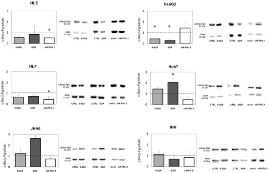 c-Src (c-Fgr) protein expression and its representative immunoblots among different HCC cell lines after treatment with 5-AZA, SOR and siR-PD-L1. Statistical analysis: * p < 0.05, Student’s t-test against CTRL or mock (=1.00; shown as dashed line). Actin (42 kDa) was used as a housekeeping protein against the c-Src (c-Fgr) (50 kDa).
