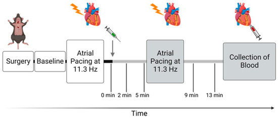 Timeline of the in vivo protocol. Gray arrow indicates point of intraperitoneal injection of either ouabain (1.5 mg/kg) or vehicle (0.9 mg/mL NaCl), and gray bars indicate period after administration. After implantation of probes, a baseline measurement was made. The protocol includes atrial pacing starting from 10 Hz (600 BPM) with stepwise increments to 11.3 Hz (678 BPM) before and after administration. Time points 0, 2, 5, 9, and 13 min represent measurements done during sinus rhythm. The protocol was finalized by blood collection from the apex 15 min after administration of ouabain or saline. Figure was created with BioRender.com.