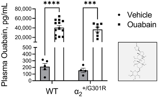 Injection of ouabain (1.5 mg/kg, i.p.,) significantly increased plasma ouabain concentrations of both WT and α2+/G301R mice (p < 0.0001; Figure 3). There was no genotype effect in plasma ouabain concentrations before and after interventions (Figure 3).