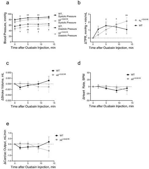 Intraperitoneal ouabain injection (1.5 mg/kg) increased blood pressure and total peripheral resistance in wild-type (WT) and α2+/G301R mice. (a) Ouabain increased blood pressure in WT and α2+/G301R mice (systolic pressure; p = 0.0193, and diastolic pressure; p = 0.0100). (b) Ouabain-induced increase in total peripheral resistance (TPR) was different between α2+/G301R and WT mice (p = 0.0340). There was no significant effect of ouabain administration on stroke volume (c), heart rate (d), or cardiac output (e) in neither WT nor α2+/G301R mice. Data were compared with two-way repeated measures ANOVA followed by Dunnett’s multiple comparison test. * p < 0.05 and ** p < 0.01 for α2+/G301R and † p < 0.05 for WT; variables at different time points vs. intragroup baseline before ouabain administration, i.e., time 0 min. n = 8. Data are available in Supplementary Table S1.