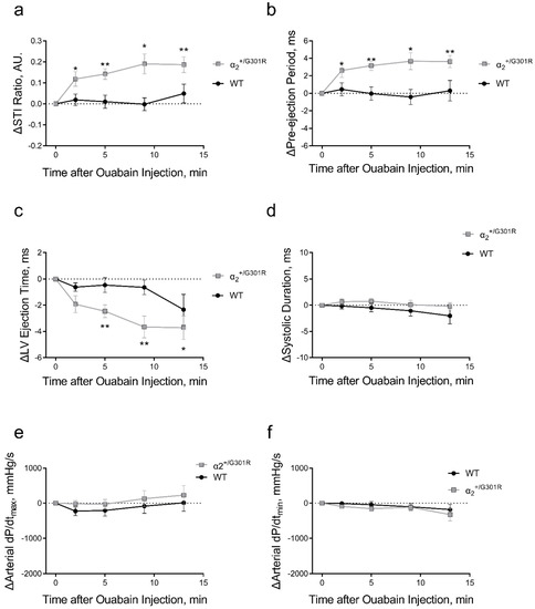 Systolic time intervals were affected by ouabain administration (1.5 mg/kg, i.p.) only in α2+/G301R mice and not in wild-type mice (WT). (a) the systolic time interval ratio (STI Ratio) was significantly increased in α2+/G301R mice only (p = 0.0004) due to (b) prolongation of pre-ejection period (p = 0.0007) and (c) shortening of left ventricular ejection time (LV Ejection Time; p = 0.0426). (d) Systolic duration, (e) arterial dP/dtmax, and (f) arterial dP/dtmin were unchanged in both WT and α2+/G301R mice after ouabain administration. Data were compared with two-way repeated measures ANOVA followed by Dunnett’s multiple comparison test. * p < 0.05 and ** p < 0.01 for α2+/G301R; variables at different time points vs. intragroup baseline before ouabain administration, i.e., time 0 min. n = 8. Data are available in Supplementary Table S1.