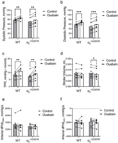 Ouabain administration increased blood pressure and total peripheral resistance in both wild-type (WT) and α2+/G301R mice when the hearts were paced at 11.3 Hz (678 BPM). Under these conditions, ouabain reduced stroke volume in α2+/G301R mice. Administration of ouabain augmented (a) systolic blood pressure (control vs. ouabain; 78.01 ± 2.14 mmHg vs. 86.71 ± 2.67 mmHg for WT and 70.19 ± 6.90 mmHg vs. 78.94 ± 7.50 mmHg for α2+/G301R mice; p = 0.0002), (b) diastolic blood pressure (control vs. ouabain; 58.01 ± 2.31 mmHg vs. 68.01 ± 2.16 mmHg for WT and 49.50 ± 7.51 mmHg vs. 59.03 ± 7.56 mmHg for α2+/G301R mice; p < 0.0001), and (c) total peripheral resistance (TPR; control vs. ouabain; 8.49 ± 0.68 mmHg·min/mL vs. 10.92 ± 1.24 mmHg·min/mL for WT and 7.31 ± 1.00 mmHg·min/mL vs. 9.48 ± 1.25 mmHg·min/mL for α2+/G301R mice; p = 0.0001). Ouabain administration significantly decreased stroke volume (d) in α2+/G301R mice (control vs. ouabain; 12.12 ± 1.54 µL vs. 11.02 ± 1.45 µL; p = 0.0473), whereas changes to stroke volume in WT mice did not achieve statistical significance (control vs. ouabain; 12.07 ± 1.53 µL vs. 11.15 ± 1.54 µL; p = 0.1062). (e) Arterial dP/dtmax (control vs. ouabain; 3367 ± 516 mmHg/s vs. 3303 ± 629 mmHg/s for WT and 2872 ± 209 mmHg/s vs. 2820 ± 174 mmHg/s for α2+/G301R mice) and (f) arterial dP/dtmin (control vs. ouabain; −1958 ± 119 mmHg/s vs. −2067 ± 172 mmHg/s for WT and −1922 ± 172 mmHg/s vs. −2009 ± 155 mmHg/s for α2+/G301R mice) were unchanged in both groups. Data were compared with multiple Wilcoxon tests or two-way repeated measures ANOVA followed by Bonferroni’s multiple comparison test. * p < 0.05, ** p < 0.01, and *** p< 0.001; intragroup variables before vs. after ouabain administration. n = 8.