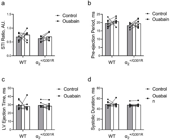 Ouabain administration significantly increased the systolic time interval ratio of α2+/G301R mice only (p = 0.0004; Figure 5a). This was associated with ouabain-induced prolongation of the pre-ejection period (p = 0.0007) and shortening of the left ventricular ejection time (p = 0.0426; Figure 5b,c). Systolic time intervals of WT mice were unchanged. The systolic duration, arterial dP/dtmax, and arterial dP/dtmin were not affected by ouabain administration in both α2+/G301R and WT mice (Figure 5d–f).