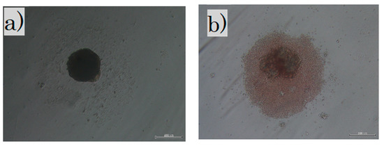 Fibroblasts were administered to the following three groups: the cultured in normal condition fibroblast (FB) group; the cultured with long-term sphere culture (LS) group where the fetal fibroblasts were cultured for 3 weeks in a non-adherent culture dish to create spheres; and the fetal skin with short-term sphere-forming culture (SS) group. The whole skin layer of E-17 was collected, treated with collagenase type 1, and cultured for 3 days in a non-adherent culture to create spheres. For the FB group, 1 × 107 fibroblast cells were administered to each mouse. For the LS group, 1 × 107 fibroblast cells were equally distributed in 96 non-adherent wells, collected three weeks later (Figure 1a), and administered to each mouse. The fetal skin of the SS group was incubated with collagenase type 1 for 45 min at 37 °C, and the blood cells and foreign substances were removed. Then, 1 × 107 cells were evenly distributed in 96 non-adherent wells and collected three days (Figure 1b) later and administered to each mouse. All cells were cultured at 37 °C in a 5% CO2 and 20% O2 atmosphere.