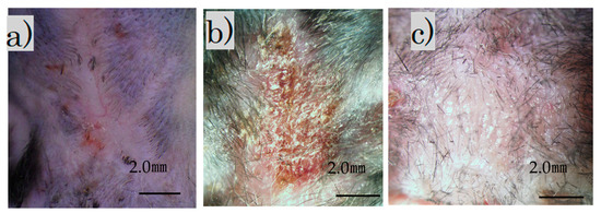 Immediately after the laser irradiation, the scar on the back contracted and became crusted. The surface was crusty and rough, with a bumpy, white, and scaly appearance (Figure 2b). Four weeks after the procedure, the scar widened slightly and became soft and flat (Figure 2c). Additionally, soft hair had grown in some areas.