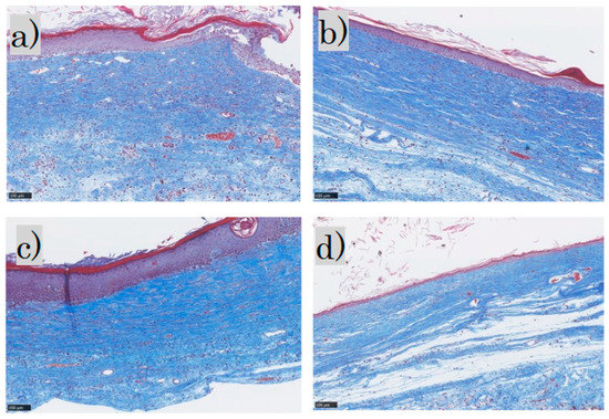 The Mouse Masson Trichrome Scar Scale (MMTSS) was developed based on the Manchester Scar Scale [9] to assess skin conditions. We calculated the condition of the epidermis and the directionality, density, and maturity of the collagen fibers in the dermis, with a score range of 0–14 (2 + (4 × 3)) (Table 1).