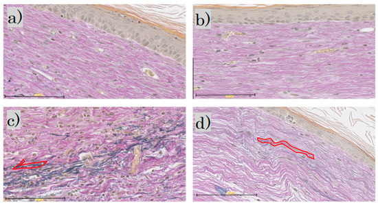 Figure 7. Elastica van Gieson staining: (a) control group; (b) FB group; (c) SS group; (d) LS group (scale bar 100 µm). FB, fibroblasts; SS, short-term sphere-forming culture; LS, long-term sphere culture. One typical purple-stained elastic fiber is circled in red.