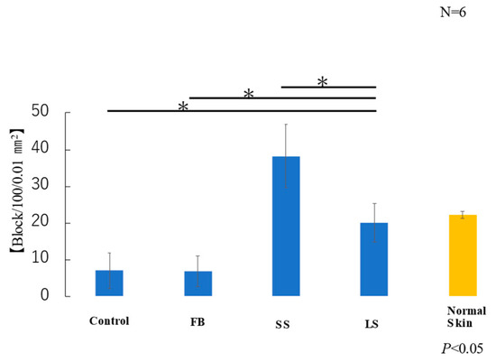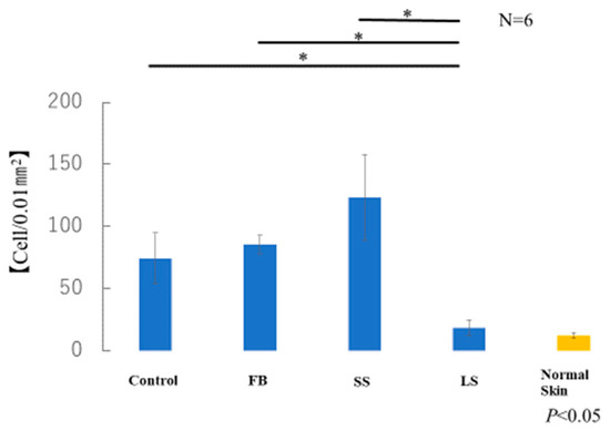 The average number of myofibroblasts in the samples taken from each of the six mice in each group was measured. The number of α-SMA-positive cells in the LS group was similar to that in normal skin (Figure 11). A significant increase in α-SMA-positive cells was observed in the control, FB, and SS groups compared with that in the LS group. Although there was no significant difference, the SS group showed a marked increase in the number of α-SMA-positive cells compared with that in the control and FB groups.