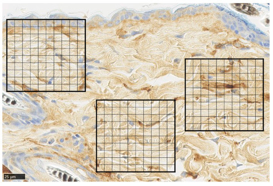 Figure 9. α-smooth muscle actin (α-SMA) staining. Tissue section of normal skin, divided into 100 equal sections of 100 × 100 µm squares (scale bar 25 µm).