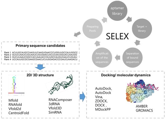 A technique assisted by a computer is being developed [] that predicts the binding affinity to the target material through the analysis of structural information []. Online-server-based programs such as RNAfold or RNAcomposer predict the secondary and tertiary structures of RNA/DNA []. This is because, as in the case of non-aptamer RNA/DNA, structural information can be obtained through the above server. It can be applied to the selection of aptamers that bind to proteins through molecular docking, providing molecular dynamic prediction based on structural information [].