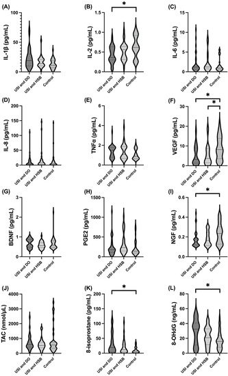 Violin plots of the levels of urinary biomarkers in the USI and DO, USI and HSB, and control groups (USI and stable bladder). Urine levels of (B) IL-2, (F) VEGF, (I) NGF, (K) 8-isoprostane, and (L) 8-OHdG were significantly different in paired comparison among the USI and DO, and control groups. Urine levels of (F) VEGF were significantly different among the USI and HSB and control groups. DO and USI, detrusor overactivity; USI, urodynamic stress incontinence; HSB, hypersensitive bladder; (A) IL-1β, interleukin-1β; (B) IL-2, interleukin-2; (C) IL-6, interleukin-6; (D) IL-8, interleukin-8; (E) TNF-β, tumor necrosis factor-beta; (F) VEGF, vascular endothelial growth factor; (G) BDNF, brainderived neurotrophic factor; (H) PGE2, prostaglandin E2; (I) NGF, neural growth factor; (J) TAC, total antioxidant capacity; (K) 8-isoprostane; (L) 8-OHdG, 8-hydroxy-2-deoxyguanosine. * p < 0.05.