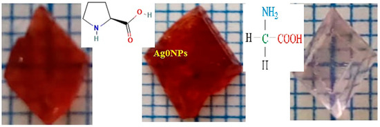 No details are reported about doping glycine and proline-single crystals by Ag0NPs [11]. Perovskites metal oxides single crystals have a molecular formula, ABO3 are pillars in electronics and nanotechnology as superconductive electrodes, magnets, insulators, etc.; have cubic or semi-cubic structure; and applied ferroelectric piezoelectric lead-based perovskites. Examples include Pb(ZrxTi1−x)O3 or Pb(Mg0.33Nb0.67)O3-PbTiO3, which are low cost; however, lead is a toxic element [12]. The phases bithmus titanate Bi4Ti3O12 and barium titanate BaTiO3, alkali Li, Na, K niobates NbO3, bismuth-alkali titanates (Na0.5Bi0.5)TiO3, K0.5Bi0.5TiO3 and their solid solutions (Ba, Ca)(Ti, Zr)O3, (Na0.5Bi0.5)TiO3-BaTiO3 are ecofriendly crystals [13,14].