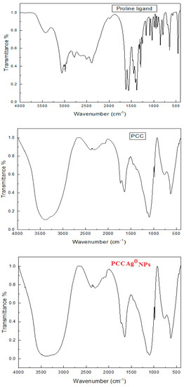 Proline exhibited no inhibition effect on all tested microorganisms. PCC and PCCAg0NPs exhibited potent antibacterial and antifungal activities. High microbial activity of PCC crystals is due to dopant Ag0NPs. PCC and PCC Ag0NPs showed significant inhibition toward K. pneumoniae, E. faecalis, A. brasiliensis and C. Albicans in comparison to the reference standard ciprofloxacin antibiotic. Doping by Ag0NPs increased chelation complexation between the crystal and DNA of microbes [44].