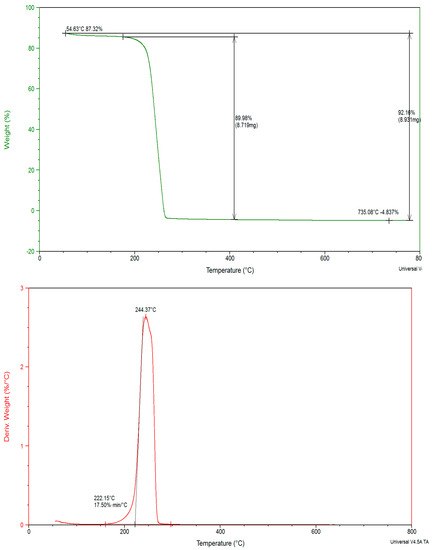 Thermal degradation confirmed the molecular structure and thermal stability. TGA and DTA thermograms of crystal are shown in Figure 3, Figure 4 and Figure 5. TGA showed weight loss of tested sample as a function of temperature or time. DTA measures temperature difference (ΔT = TS − TR) between the sample (S) and reference (R) materials at zero heat flow difference (ΔH = HS − HR = 0).