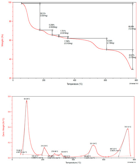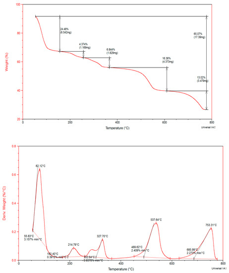 Thermogravimetric analysis, TGA and differential thermal analysis, DTA are determined using Shimadzu DTA/TGA-50, heating rate 10 °C/min, platinum cell under nitrogen, and flow rate 20 mL min−1 [17,18].