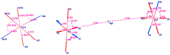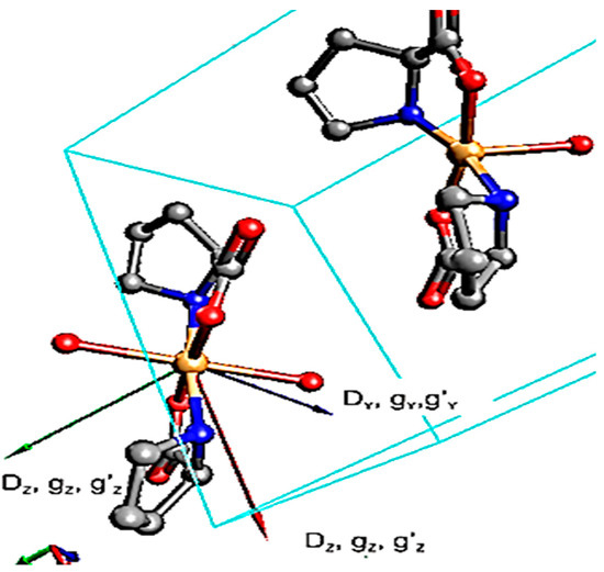 Molecular orbital calculations, performed by qualitative analysis performed by Ab initio calculations following CASSCF method, Gaussian software program suggested distorted Oh symmetry around Co(II) ion. Elongated Co-O bonds with water molecules in comparison to proline favors magnetic anisotropy, (Figure 12) zero field splitting (ZFS) parameters D and E in Griffith Hamiltonian are obtained using five magnetic parameters: gx, gy, gz, D, and η following Equations (7) and (8), Bond length, Å and bond angle° of PCC are collected in Table S2 [41]: