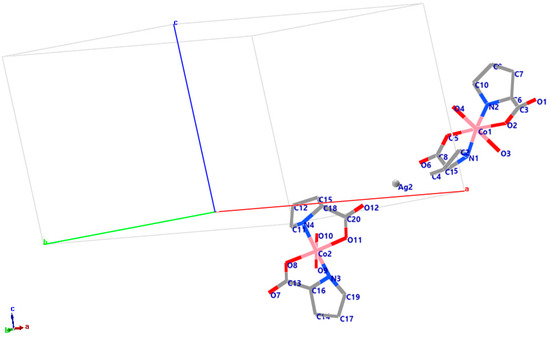 NH group and O atoms of proline give bidentate chelating, forming a distorted octahedral geometry because imperfect bond angles. The equatorial plane is by O3, O16 of 2 COOH groups and (N6, N14) atoms. Bond angles ranges 84.83 (2)–95.74 (5)°. Axial sites are occupied by O7, O12 of 2 coordinated water with bond angles 78.29 (9)–101.63 (4)°. Geometry around Co(II) ion is distorted elongated Oh with short bonds at equatorial positions at range [1.91 (6)–1.97 (5) Å]. Long bonds formed at axial positions [Co(1)–O(7) is 2.31 (4) Å; Co(1)–O(12) is 2.29 (4) Å]. The axial angle O7–Co1–O6 is 179.09 (4)°. The equatorial angles [O3-Co1-O16; N6-Co1-N14 are 172.34 (2)° and 177.00 (3)°, respectively, are close to linearity. Average Co–O and Co–N bond lengths confirmed Co(II) distorted Oh geometry. Doped Ag0NPs had unchanged crystal geometry around the Co(II) ion type, but changed dimensions of the crystal size by expanding the crystal size [35]. The geometry around the Co(II) ion has the same chelating manner, bond length and bond angle as PCC formed distorted Oh, Ag0NPs bind Co and proline via Van der Waals interaction [36,37]. All bond lengths and bond angle° of PCC are collected in Table S2.
