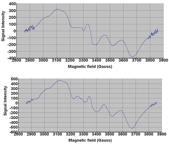X-band electron spin resonance spectra at room temperature using a reflection (JES-RE1X ESR. ESR spectrometer) at 9.43 GHz in cylindrical resonance cavity, 100 kHz modulation, 5 mW electric power and LMR Gauss meter control applied magnetic field.