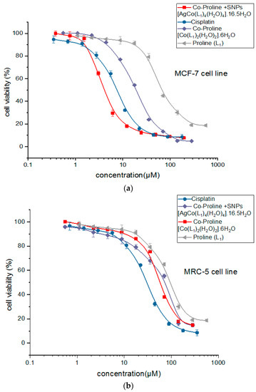 Concentration-dependent cytotoxicity curves for the tested single crystals for: (a) MCF-7 cell lines, (b) MRC-5 cell line.