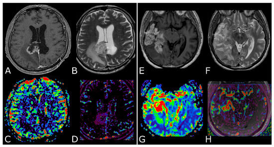 LGGs are mostly characterized by native vessel while the hypoxic angiogenic microenvironment of HGGs presents with an increased number of leaky vessels [23]. These features are reflected by increased microvascular proliferation and increased BBB permeability in more aggressive tumors. In fact, numerous studies have demonstrated DSC-rCBV and Ktrans to be consistently higher in HGGs. ASL-derived CBF has also been reported to be higher in HGGs [24,25]. K.M. Schmainda et al. reported DSC-rCBV of 1.4 to have sensitivity/specificity of 90/77% in distinguishing LGGs from HGGs [26]. However, several papers suggest different threshold values, so that no clinically useful threshold values are currently available (Figure 4) [27,28].