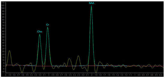 The MR spectrum comprises a set of peaks (or resonances) of different metabolites distributed along the x-axis and labelled in parts per million (ppm). The amplitude of the resonances is measured on the y-axis using an arbitrary scale; the area beneath the peak represents the concentration of the metabolite [98,99].
