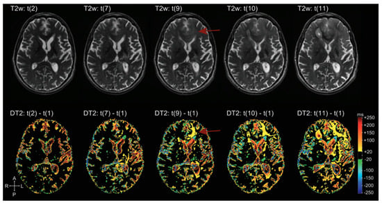 - Ellingson, B.M.; Cloughesy, T.F.; Lai, A.; Nghiemphu, P.L.; Lalezari, S.; Zaw, T.; Motevalibashinaeini, K.; Mischel, P.S.; Pope, W.B. Quantification of edema reduction using differential quantitative T2 (DQT2) relaxometry mapping in recurrent glioblastoma treated with bevacizumab. J. Neuro-Oncol. 2012, 106, 111–119. [Google Scholar] [CrossRef] [PubMed]