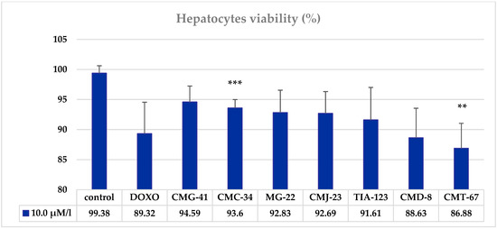 Analysis of the results of the MTT test showed that the viability of cells treated with CCT at a concentration of 10.0 μM/L significantly decreased only under the influence of CMC-34 (5.8%, p < 0.001) and CMT-67 (12.5%, p < 0.01), while other CCTs insignificantly reduced the viability of hepatocytes by 5–11% (p > 0.05). The addition of DOXO in a concentration of 10.0 μM/L to the hepatocytes culture induced a non-significant decrease of the hepatocytes’ viability (10%, p > 0.05). It can be concluded that CCT at a concentration of 10.0 μM/L did not have a toxic effect on the liver cells, which largely retained their viability, possibly due to preserved metabolic functions.
