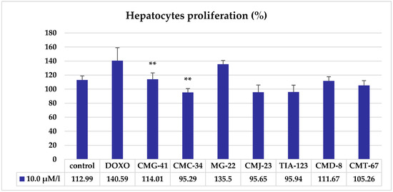 The effect of CCT 10.0 μM/L on the proliferation of hepatocyte culture, assessed using the resazurin test, differed from the effect of CCT at the same dose, established on viability using the MTT test. Thus, the statistically significant modifications of the hepatocytes proliferation were attested when the hepatocytes were treated with CMG-41 (+2%, p < 0.01) and CMC-34 (−17.7%, p < 0.01), the statistically non-significant increase was produced by MG-22 (22.51%, p > 0.05) and DOXO (27.69%, p > 0.05), while there was a statistically non-significant decrease by CMJ-23 (17.34%, p > 0.05), TIA-123 (17.05%, p > 0.05), CMD-8 (101.32%, p > 0.05) and CMT-67 (7.73%, p > 0.05).