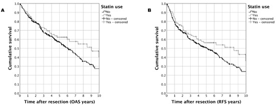 Survival in a matched-pair cohort of OSCC patients with age at diagnosis <50 years (n = 359) comparing patients taking statins to those patients without statin treatment: (A): Kaplan–Meier analysis for OAS (p = 0.099); (B): Kaplan–Meier analysis for RFS (p = 0.074).