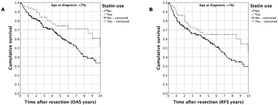 Survival in a matched-pair cohort of OSCC patients with age at diagnosis <70 years (n = 246) comparing patients taking statins at the time of diagnosis compared to those patients without statin treatment: (A): Kaplan–Meier analysis for OAS (p = 0.014); (B): Kaplan–Meier analysis for RFS (p = 0.032).