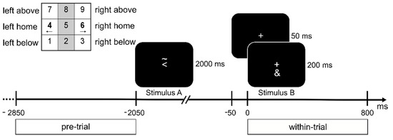 Stimuli were shown in white on a black background on a 17-inch CRT screen at a viewing distance of 60 cm from the participants. Each trial consisted of two tasks nested within each other (stimulus–response pattern ABBA). A fixation cross was displayed for 50 ms at the beginning of each trial. Then, Stimulus A was presented for 2000 ms. The response for Stimulus A (S1) had to be planned and withheld until the response for Stimulus B (S2). After the presentation of Stimulus A, a fixation cross was displayed for 50 ms and followed by Stimulus B, which was presented for 200 ms. Stimulus A consisted of a left-pointing or right-pointing arrowhead and the symbol “~” either above or below the arrowhead. The arrowhead indicated the response hand (i.e., left or right hand), whereas the symbol “~” indicated the response direction (i.e., up or down). A series of three consecutive button presses was required for Stimulus A: first, the home key on the side described by the arrowhead (i.e., left or right), followed by a press on the key above or below in the direction of the asterisk, and lastly, the home key had to be pressed for a second time (see Figure 1). Stimulus B was either the symbol “&” or “#”, which indicated a left or right button press, respectively. Stimulus B required a single button press on the response side corresponding to the stimulus. The numerical pad on the keyboard was used for the participant’s responses. The buttons 1, 4 and 7 (below, home and above) were used for the left response direction, and the buttons 3, 6 and 9 were used for the right response direction. The participants were instructed to leave their index fingers on the corresponding sides of the numerical pad. If Stimulus A consisted of a right-pointing arrowhead with the symbol “~” below it and Stimulus B was the symbol “&”, the correct response sequence was 4 (left home key)—6 (right home key)—3 (below)—6 (right home key). Participants performed a practice round of 40 trials before a total of 256 trials were presented in four blocks. Of these 256 trials, half of the trials revealed a feature overlap in the response side (same hand used for the response for Stimulus A and B), and the other half of the trials revealed no feature overlap (different hands used for Stimulus A and B).