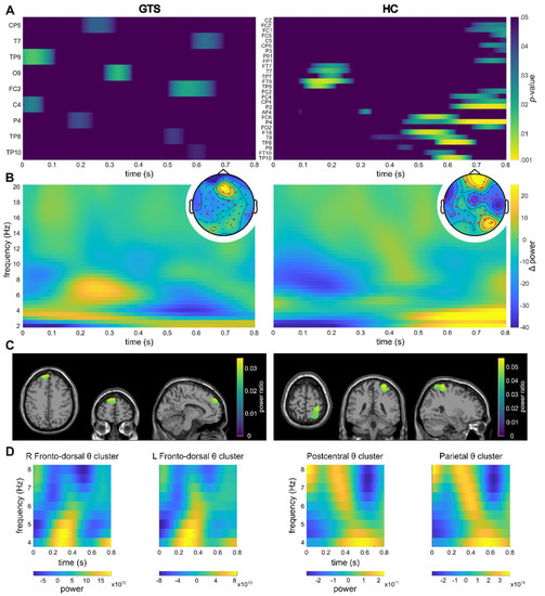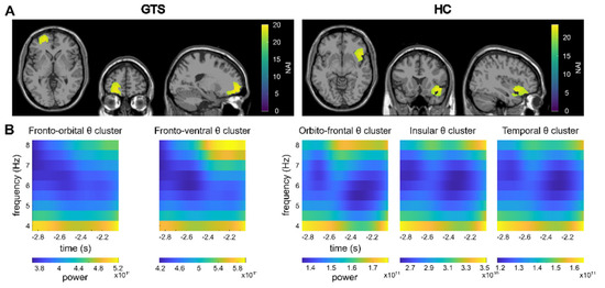 For the pre-trial interval, the TBA cannot be compared to another condition or interval, as the pre-trial interval encompasses the period that is typically used as a baseline. Hence, it is not possible to establish whether the TBA activity in the pre-trial interval differs from random signals on the electrode level. As the clusters identified on the source-level show significant correlations even after FDR-correction was applied, we conclude that the activation in the identified regions is meaningful, as the correlations between random/non-meaningful signals multiplied with a filter created from the signals (see Section 2.3—LCMV beamforming) cannot be significant. In the GTS group, clusters of theta activity were revealed within the left medial frontal cortex and the left fronto-ventral cortex in the pre-trial interval (Figure 3).