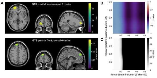 Main results of the correlations in the GTS group are shown. (A) Theta clusters: the top figure depicts theta band activity in the fronto-ventral cluster as identified by the DBSCAN algorithm in the pre-trial interval. The Neural Activity Index (NAI) is shown for voxels within the cluster. The bottom figure depicts the within-trial left fronto-dorsal theta cluster. For voxels within the cluster, the source ratio (difference between the feature overlap levels divided by the sum of the overlap levels) is color-coded. (B) The correlation map between the clusters from Figure 3A is shown. The correlation map shows the Pearson correlation for each time point between the pre- and within-trial tasks (color represents the r-value). (C) FDR-corrected q-values for the correlation map Figure 3B. Black areas indicate no significant correlation (q > 0.05), whereas bright areas indicate a significant correlation.