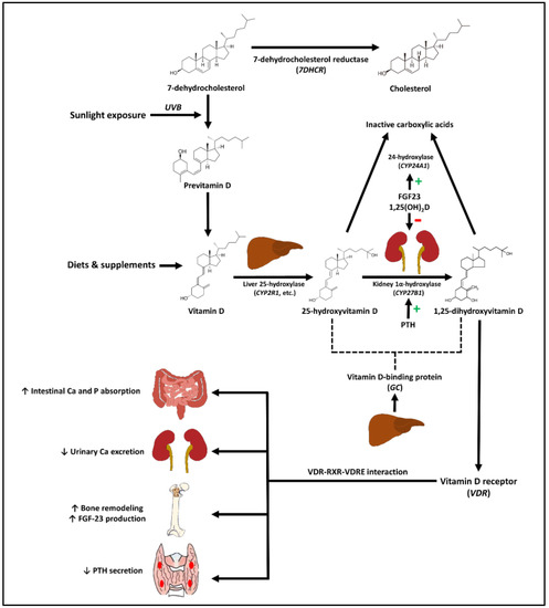 1,25(OH)2D interacts with the intracellular nuclear VDR (encoded by the VDR gene) that forms a heterodimer complex with the retinoid X receptor (RXR) in the target cells. The activated VDR-RXR heterodimer complex, in turn, alters the expression of its target genes by interacting with the vitamin D-response elements (VDREs) in the target genes [16,17]. The 1,25(OH)2D-VDR-RXR-VDRE interaction also regulates 1,25(OH)2D level by inducing its destruction by upregulating the expression of the gene CYP24A1, encoding the enzyme 25-hydroxyvitamin D-24-hydroxylase that metabolizes 1,25(OH)2D and 25(OH)D into inactive carboxylic acids [18]. In addition, the enzyme 1α-hydroxylase, responsible for conversion of 25(OH)D into 1,25(OH)2D in the kidney is enhanced by the action of parathyroid hormone (PTH) and inhibited by the actions of 1,25(OH)2D and fibroblast growth factor-23 (FGF23) [13,14,19].