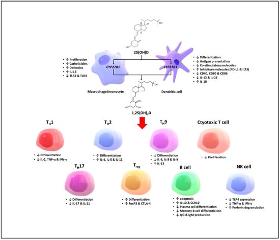 Effects of vitamin D on different cell types of the innate and adaptive immune systems. Abbreviations: 1,25(OH)2D: 1,25-dihydroxyvitamin D; 25(OH)D: 25-hydroxyvitamin D; CCR10: C-C chemokine receptor type 10; CTLA-4: cytotoxic T-lymphocyte-associated protein 4; CYP27B1: Cytochrome P450 family 27 subfamily B member 1; FoxP3: Foxhead box P3; IFN-γ: Interferon-γ; IgG: Immunoglobulin G; IgM: Immunoglobulin M; IL-1β; Interleukin-1β; IL-2: Interleukin-2; IL-4: Interleukin-4; IL-5: Interleukin-5; IL-8: Interleukin-8; IL-9: Interleukin-9; IL-10: Interleukin-10; IL-13: Interleukin-13; IL-17: Interleukin-17; IL-21: Interleukin-21; ILT3: Immunoglobulin-like transcript-3; NK: Natural killer; PD-L1: Programmed death-ligand 1; TH1; T helper 1; TH2: T helper 2; TH9: T helper 9; TH17: T helper 17; Treg: Regulatory T cell; TNF-α; Tumer necrosis factor-α; TLR2: Toll-like receptor 2; TLR4: Toll-like receptor 4 [21].