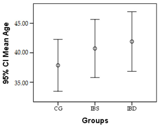 The age distribution according to the study group is shown in Figure 1. Thus, peri-odontal infections tested by Micro-IDent®plus tests were confirmed even at young ages (mean 37.86 ± 13.21 years) in CG, and 40.73 ± 16.22 in IBS group, and 41.90 ± 16.23 in IBD group.