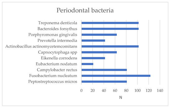 Fusobacterium nucleatum, Bacteroides forsythus, and Treponema denticola have been identified as potential oncogenic bacteria [21,22,23,24,25]. Peptostreptococcus has been associated with endocarditis [26], Campylobacter rectus and Porphyromonas gingivalis with cytokines and inflammation [27], Eubacterium nodatum and Prevotella intermedia with descending necrotizing mediastinitis [28], and Eikenella corrodens with intra-abdominal infections [29]. Capnocytophaga spp. have been correlated with systemic infections [30], and Actinobacillus actinomycetemcomitans in coronary heart diseases including cardiomyopathies [31]. These diseases, which can have a negative impact on the body and a course with a high severity, are based on periodontal infection with the presence of the studied bacteria.