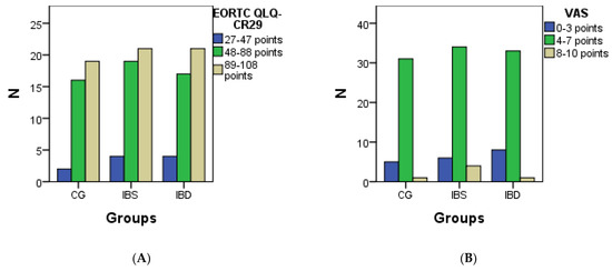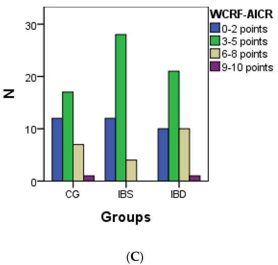 Pain present but not affecting daily activities, assessed by the VAS test, was observed in all three groups. In the case of the WCRF/AICR test, in terms of compliance with specific recommendations, a partial compliance with the recommendations was observed, with the groups with the highest compliance being the IBD group. Failure to comply with specific recommendations can lead to worsening health and affect quality of life.