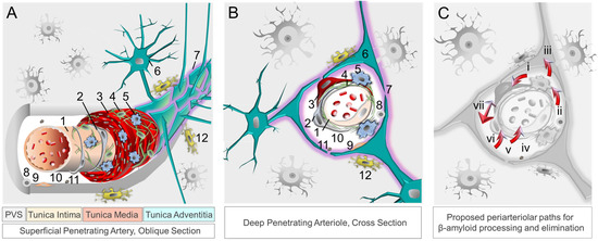 The neurovascular–perivascular unit and recognized βA and brain metabolite clearance mechanisms. Neurovascular and perivascular elements facilitate nutrient exchange as well as metabolism and removal of metabolic wastes, including βA. The neurovascular unit, depicted in oblique section (A) and cross section (B), is composed of (1) endothelial cells, (2) pericytes, (3) smooth muscle cells, (4) reticular cells, (5) macrophages, and (6) astrocytes comprised of (7) aquaporin-4 expressing astrocytic end-feet. The perivascular space harbors (8) other immune cells, (9) fibroblasts, (10) apolipoprotein E, (11) and extracellular matrix components, while (12) microglia are present in adjacent brain tissue. Metabolites, including βA and tau, are ultimately cleared from the brain by interstitial fluid flow in combination with other mechanisms (C), including phagocytosis [by (i) vascular smooth muscle cells, (ii) macrophages, (iii) glial cells, and (vi) pericytes]; (iv) apolipoprotein E-mediated processes); (v) transcytosis across the blood–brain barrier; receptor-mediated endocytosis (involving various immune and other cell types); (vii) perivascular glymphatic mechanisms [62,63,121]. Abbreviation: β, beta; PVS, perivascular space.